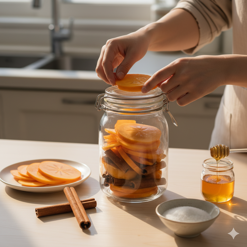 설탕이 녹으면 냉장고에 넣어 2~3일 정도 숙성시킵니다. (숙성 과정을 통해 단감의 풍미가 깊어집니다.)