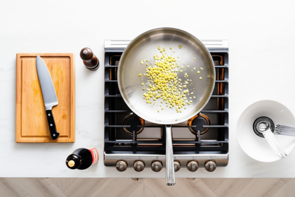 팬에 올리브 오일을 두르고 다진 생강을 넣어 향을 낸 후, 양파를 볶아줍니다. (생강은 소화를 돕고, 혈액순환 개선 효과가 있습니다.)
