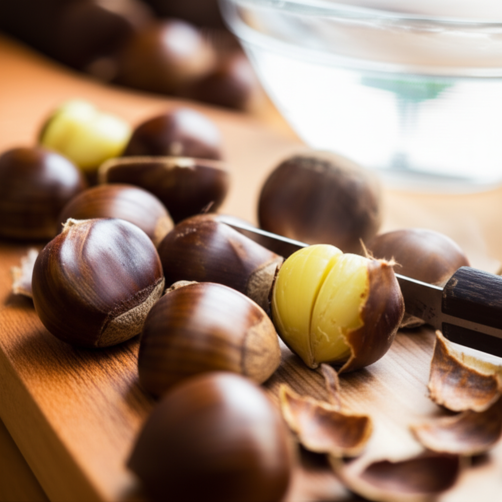 밤 껍질을 벗길 때는 칼을 사용하여 조심스럽게 벗겨야 합니다. 뜨거운 물에 살짝 데치면 껍질을 벗기기 더 쉽습니다.